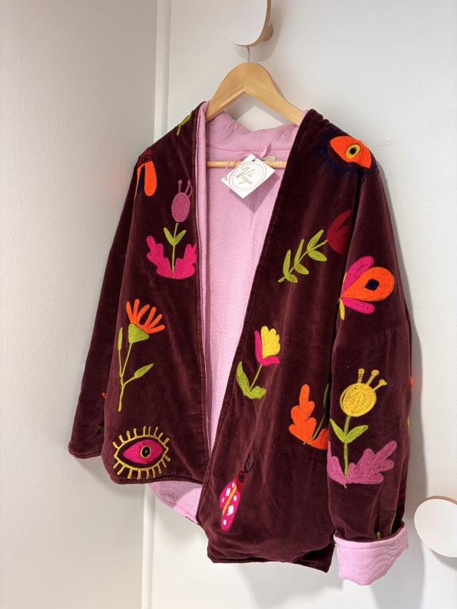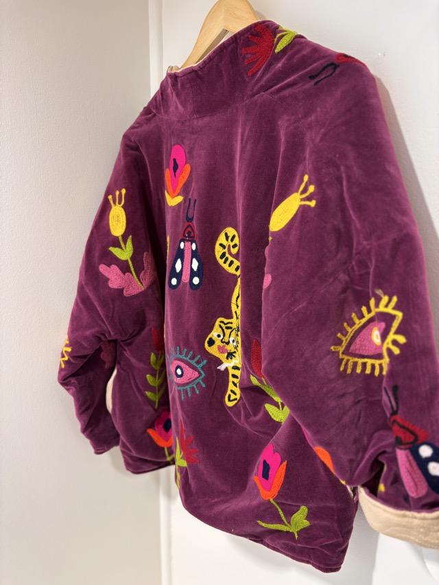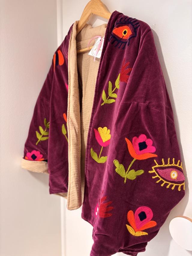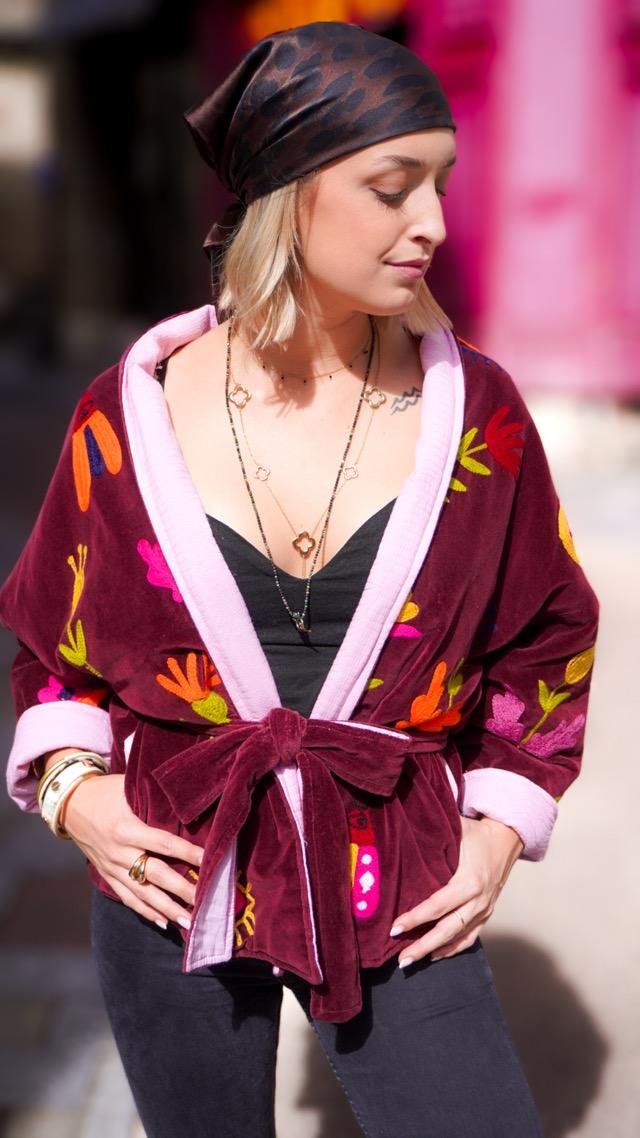 a veste Frida, c’est l’esprit bohème chic en version colorée et pétillante, Elle apporte une touche artistique et joyeuse à toutes vos tenues. Elle est disponible en deux coloris : bordeaux ou violet.